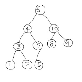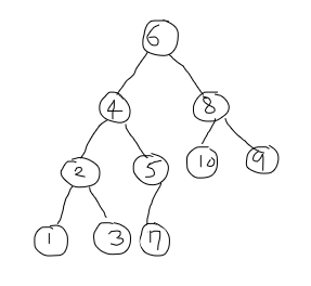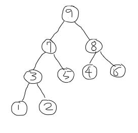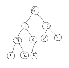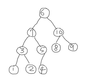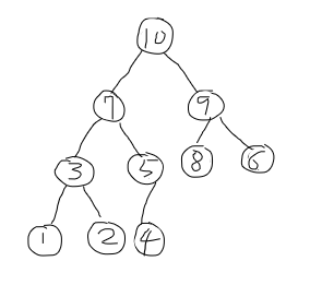 6. 0번 인덱스인 6과 7과 10 중 더 큰 10을 비교해서 10이 더 크기 때문에 자식이 위로 올라온다. 그리고 바뀐 6도 자식 노드인 8과 9를 비교해 더 큰 9가 6보다 크기 때문에 6과 9를 변경해준다.