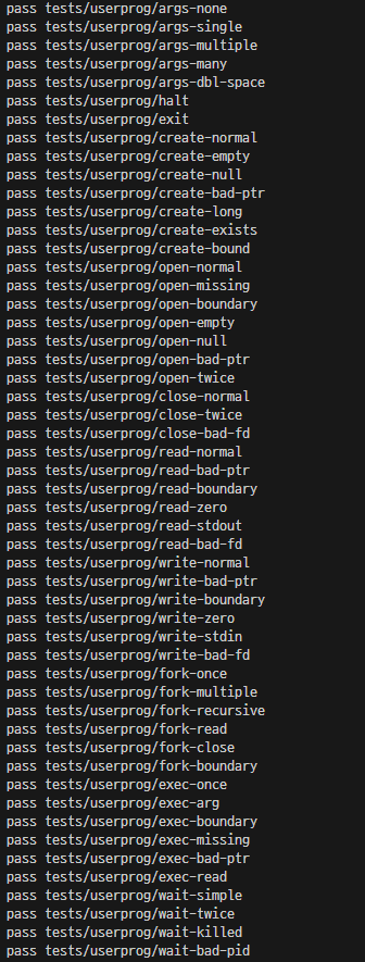 94개의 테스트가 끝나고 1개의 테스트만 남았다. 시스템 콜 부분은 싹 다 해결했지만 multi-oom 테스트가 실패했는데, 이 부분은 구글링을 해본 결과 모든 메모리 누수를 막고 파일 생성에 제한을 둬야 하는 것 같다. 열심히 찾아보고 수정해봤으나 해결이 안되어 유종의 미로 테스트 한 개를 남기고 WIL을 팀원과 함께 작성했다. 3주간 핀토스 개빡세게 달린 재희님과 강민님에게 건배🍺