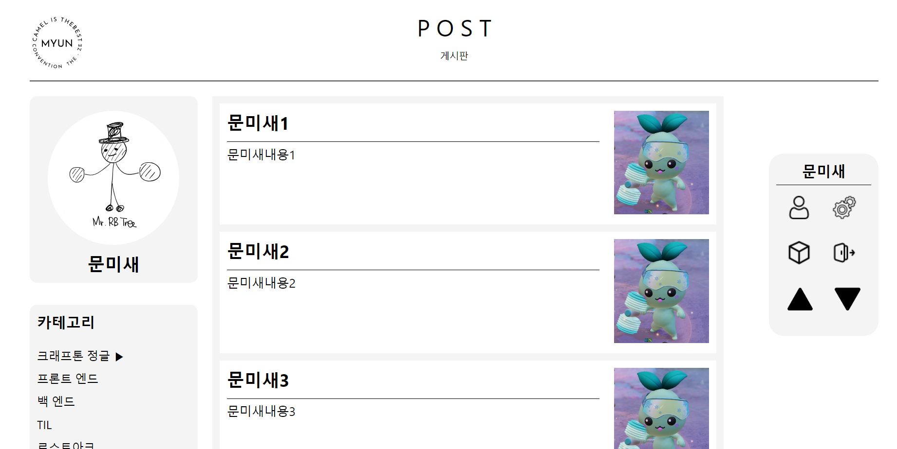 우측 사이드 바에는 마이페이지, 설정, 미정, 로그아웃 아이콘하고 밑에 위로 이동, 밑으로 이동 버튼을 만들어줬는데, 설정 부분은 게시판에 대한 설정이 없기 때문에 아마 회원정보 수정으로 넣지 않을까 싶다.