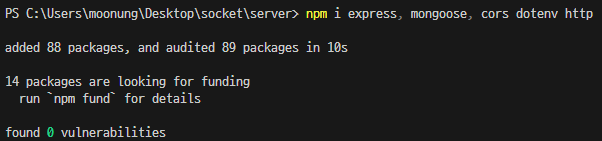 이 후, express와 mongoose, cors dotenv http를 설치해줬다.
