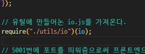 프론트에서 소켓 라이브러리를 이용해 서버 포트인 5001번을 담아 외부에서 사용할 수 있게 작성했다.