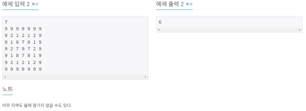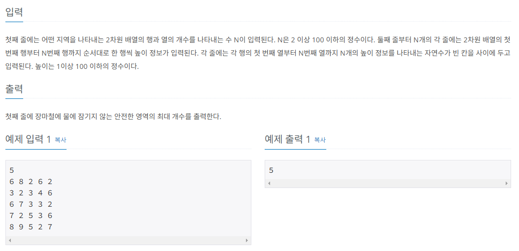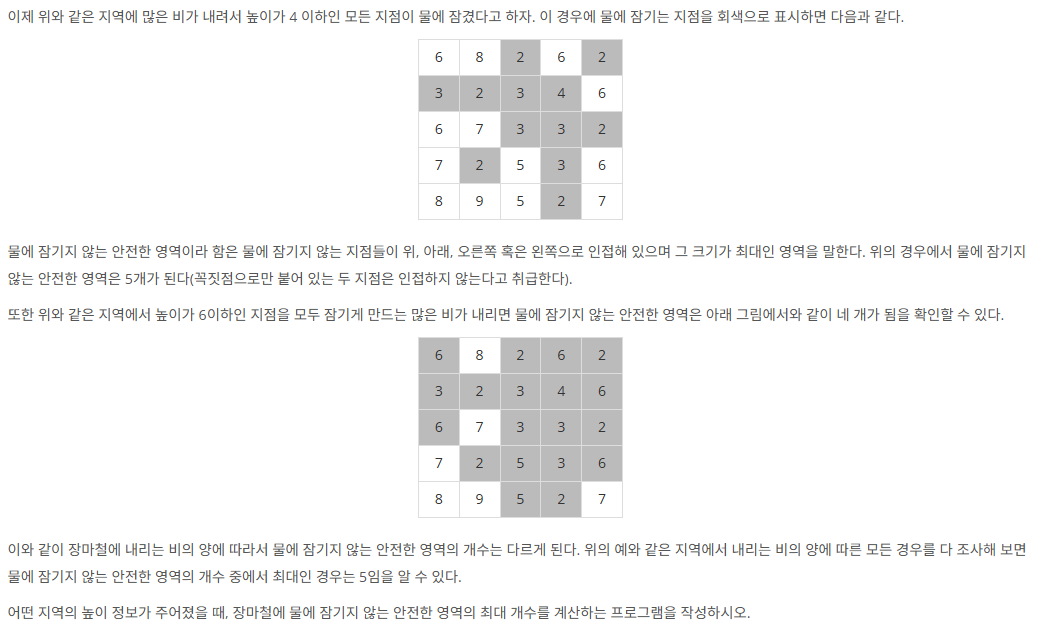 이 문제는 물에 잠기지 않은 안전한 영역의 최대 갯수를 구하는 문제이다.
