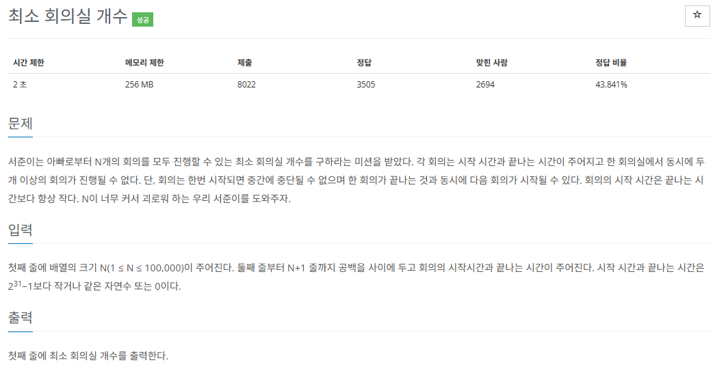 회의할 수 있는 최소 회의실 개수를 구하는 문제이다.
