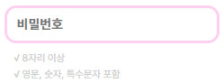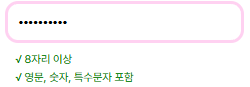 비밀번호는 두 가지 체크가 있는데 8자리 이상 작성했을 시 첫 줄이 활성화, 대소문자, 숫자, 특수문자를 넣을 시 두 번째 줄이 활성화가 된다. 이 부분은 따로 체크되기 위해 정규식을 나눴는데 길이 부분은 단순히 8자까지만 체크 되게 해서 해당 값의 길이가 8자 이상이 되면 true가 되게 적용했다. 그 외의 입력값 체크는 기존 정규식을 사용했다.