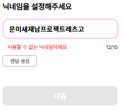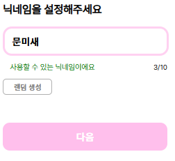 처음에는 아무 표시도 없고 해당 입력창에 값을 입력했을 시 현재 입력값의 길이가 실시간으로 보이며 10글자 이하로 입력되면 초록색으로 사용할 수 있다고 표시되고 다음 버튼이 활성화 된다. 그러나 10글자를 넘겨버리면 사용할 수 없는 닉네임이라고 표시되며 다음 버튼이 비활성화 되어 넘어갈 수 없게 되어있다.