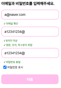비밀번호 표시는 위치가 애매해서 제일 밑에다 두었고 표시를 체크하면 비밀번호와 비밀번호 확인이 둘다 보이게 된다. 해당 UI에서는 표시를 각각 분리하면 너무 난잡해보일 것 같아 하나로 통일하여 사용했다.