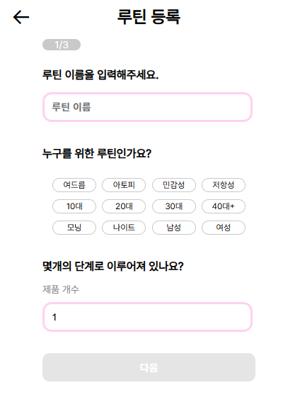 2페이지는 1페이지에서 입력한 단계 개수에 따라 루틴 입력 칸이 생성되도록 했다. 그리고 해당 루틴 칸마다 루틴의 주제, 설명, 루틴에 사용하는 제품명, 총 3개의 입력값을 객체로 받을 수 있게 리덕스에서 미리 묶어놨다.
