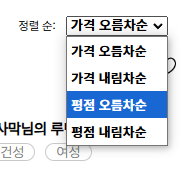 어제 회의로 정렬 필터를 가격 오름차순, 내림차순, 평점 오름차순, 내림차순 총 4개를 적용하기로 했다.