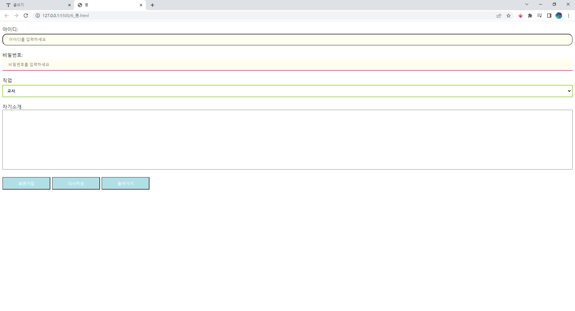 하나씩 적용하면 따라가며 공부할 수 있는데 폼 태그 같이 전체적인 속성을 한번에 적용하는 방식은 많이 헷갈려서 원하는대로 적용하기가 너무 어려웠습니다. 회원가입창 하나 만드는게 이렇게 어려운지 직접 만들어봐야 깨닫네요