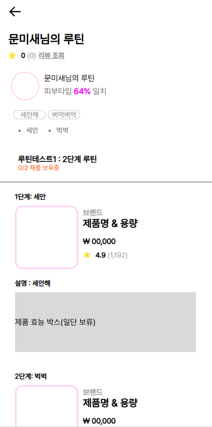 problem과 tag의 경우엔 현재 서버에서 코드를 수정중이라 UI를 위해 다른 데이터를 넣어놨다. 이런식으로 데이터가 주어지고 이제 해당 item_key로 루틴 제품의 데이터도 가져와 화면에 뿌려주면 될 것 같다.