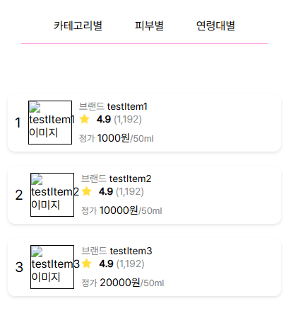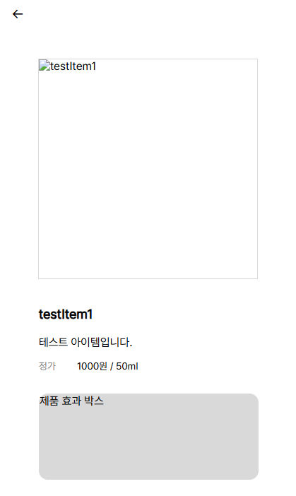 이미지와 브랜드를 제외하고 데이터를 받아온 걸 볼 수 있다. 아무래도 이미지가 없다보니 심심한 느낌이 드는데 데이터 연동이 된 것을 확인했기 때문에 나중엔 데이터만 추가해 받아오면 될 것이다.