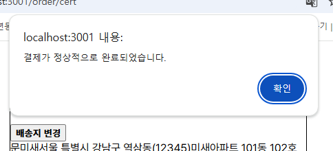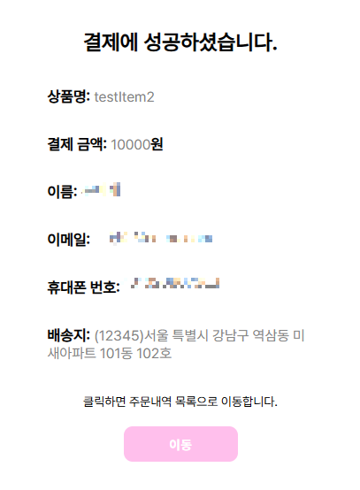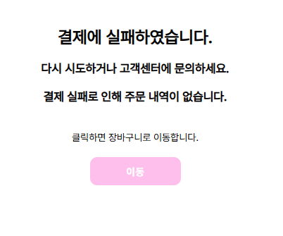 결제 정보 페이지가 뜨며 버튼을 누르면 마이페이지의 주문내역페이지로 이동한다. 만약 결제를 실패하면 화면에 데이터는 담기지 않고 장바구니로 다시 이동하라는 버튼이 뜬다.