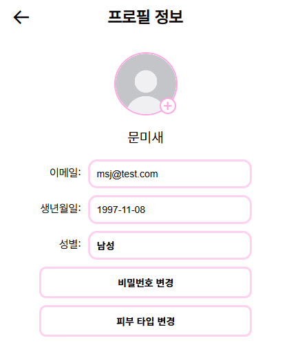 정보창엔 이메일, 생일, 성별을 확인 가능하며 비밀번호 변경 버튼과 피부 타입 변경 버튼이 있다.