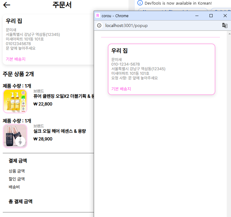 여기서 배송지 변경이 안되는 버그가 있었는데, 배송지 변경을 클릭하면 팝업창으로 작은 새 페이지로 뜨게 된다.