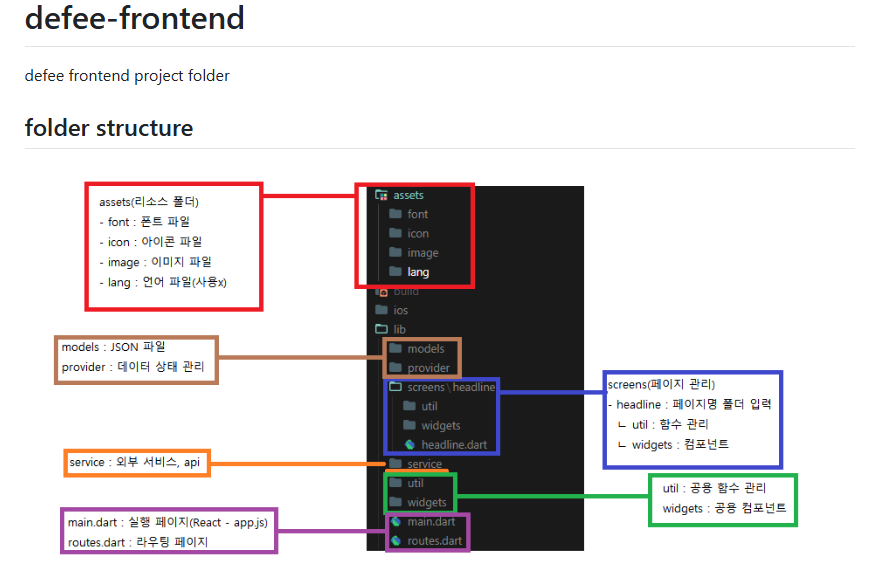 구글링을 하며 보통 flutter 프로젝트의 구조가 어떻게 짜여지는지 찾아보고 똑같이 만들어놨으며, 팀원들에게 해당 구조대로 작업해달라 언급하고, 정해둔 컨벤션 규칙을 따라 커밋을 작성하기로 했다.