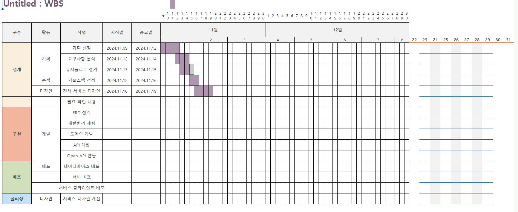 이어서 재희님이 만들어논 WBS 표에 진행상황을 기록하며 작업을 시작하기로 했다.