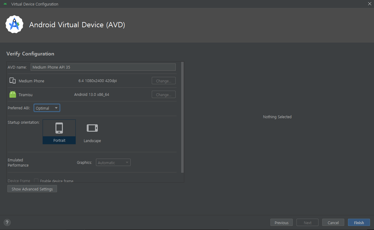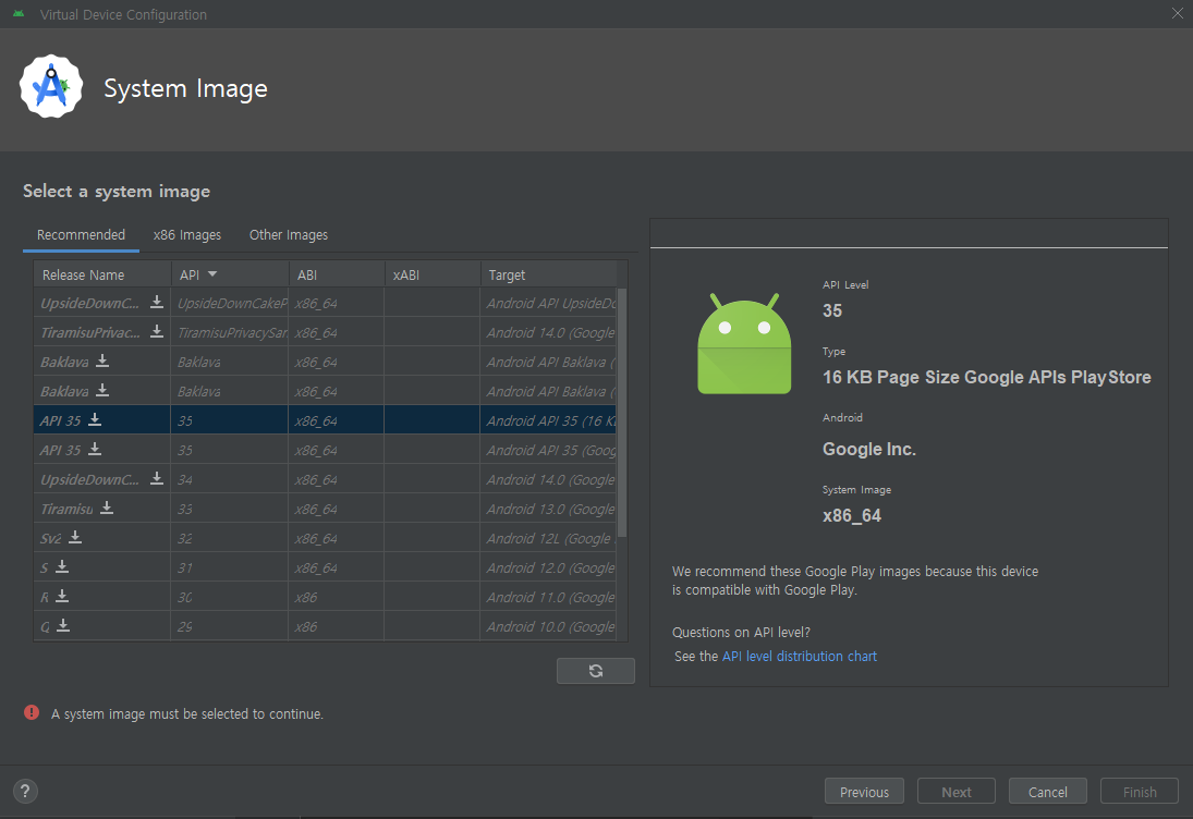 설치가 끝난 이 후 원하는 디바이스를 선택하고 넘어오면 System Image를 설정하게 되는데, 여기서 설치할 수 있는 옵션을 선택해 설치하라고 한다. 자세힌 모르겠지만, 이전에 적용시켰던 버전으로 API 35와 Tiramisu 버전을 다운받았다.