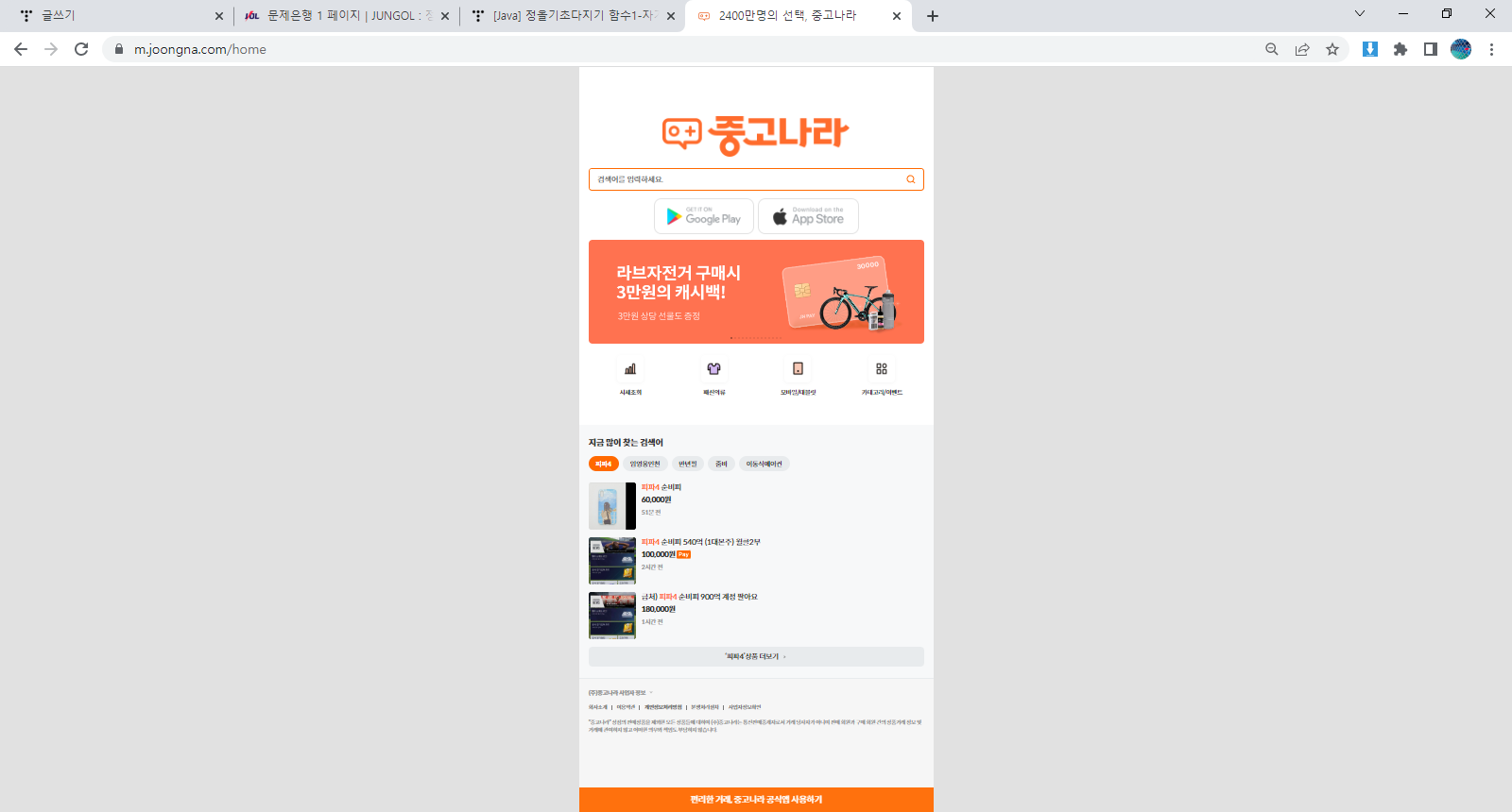 중고나라도 다른 사이트처럼 어플만 관리하지만 모바일 화면 자체를 홈페이지로 볼 수 있게 나와있습니다