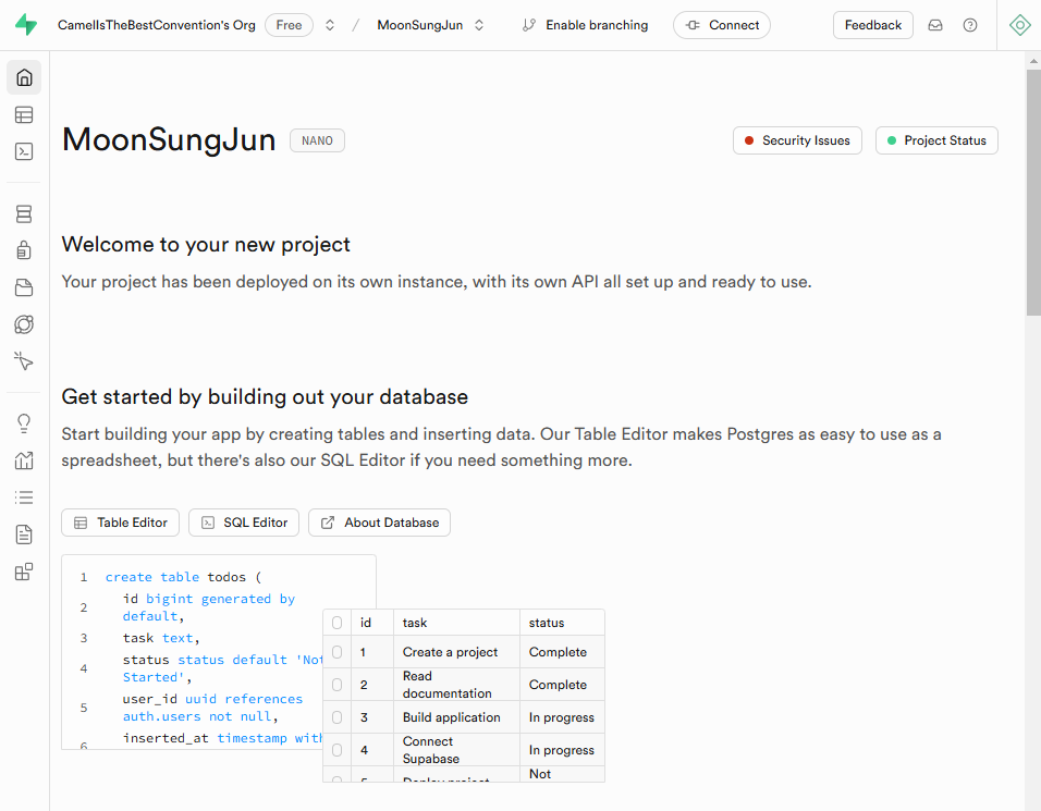 supabase는 어느 회사에서 면접 보는 중에 면접관님이 알려주셨다. 협업도 중요한데 개인의 기량을 위해 개인 프로젝트 하는 것도 괜찮을 것 같다며, 무료에다 sql기반으로 혼자서 풀스택처럼 할 수 있다고 사용을 추천해주셨다.