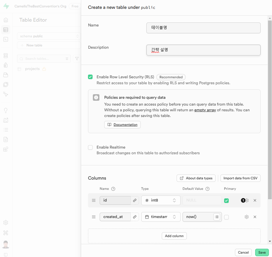 수파베이스에 로그인해서 테이블 생성으로 넘어가면 테이블 설정을 할 수 있다.