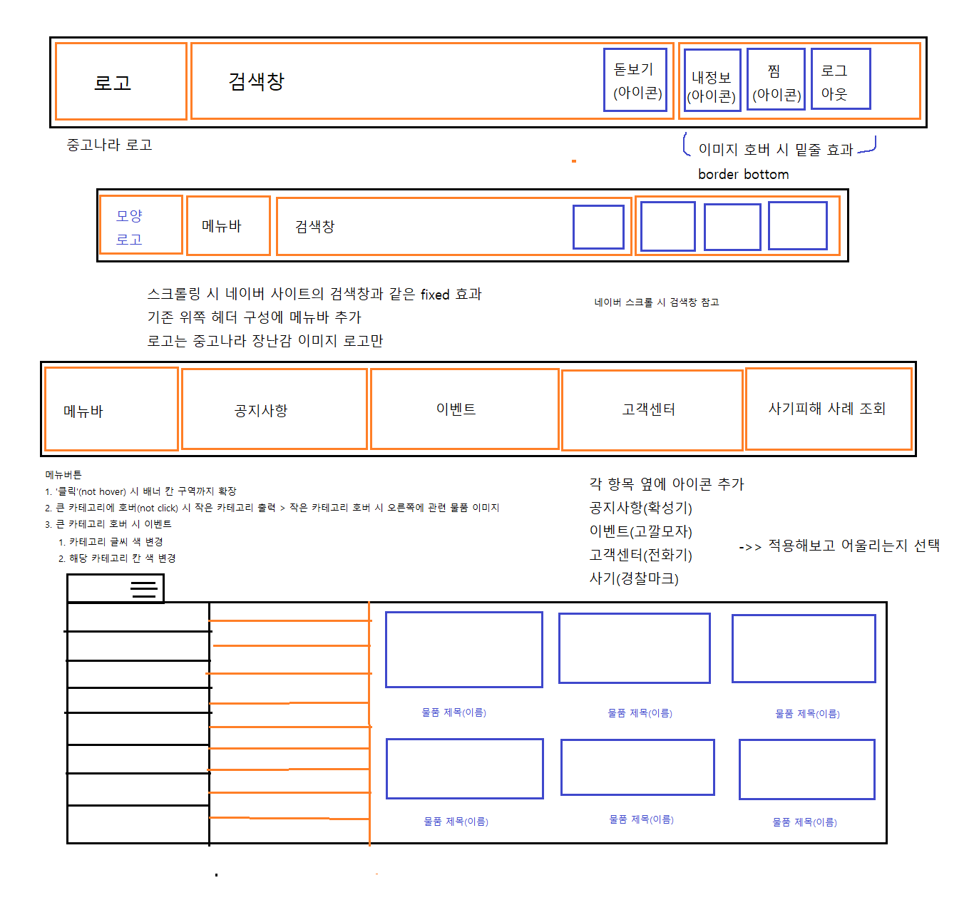 두번째 헤더에는 카테고리만 있되 카테고리 좌측의 목록 아이콘을 누르면 숨겨진 카테고리가 밑으로 내려오며 마우스로 가져간 목록은 검은색에서 주황색으로 글자가 변경됩니다. 그리고 각 카테고리 부분마다 다른 하위 메뉴를 주어 다른 메뉴를 선택하면 각자 하위메뉴로 바뀌게 만들려고 합니다