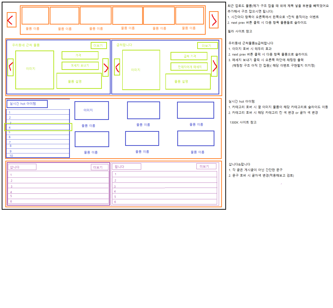 상단부터 헤더 부분과 광고 부분, 실시간 물품 부분, 거래게시판, 푸터, 사이드바로 구성되어 있습니다