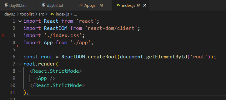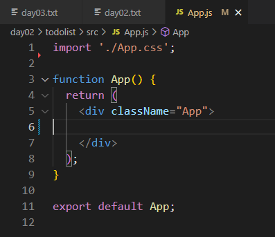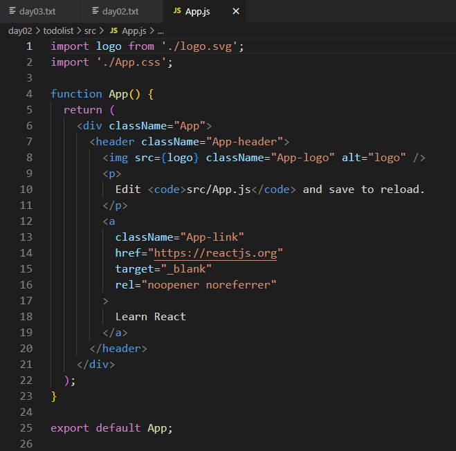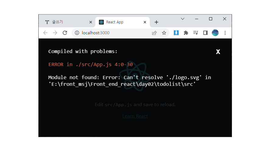 logo.svg는 아까 저희가 필요없다고 삭제한 파일중 하나인데 오류가 생긴 App.js 파일로 가보면