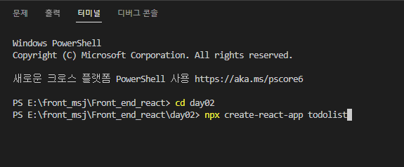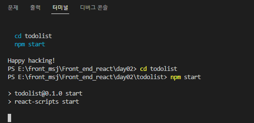 먼저 터미널을 실행할 폴더안에 리액트 파일을 만들어야합니다