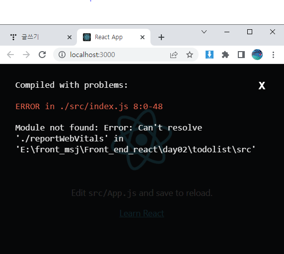 하지만 여기서 터미널이나 브라우저창을 보면 오류가 나있는걸 볼 수 있습니다