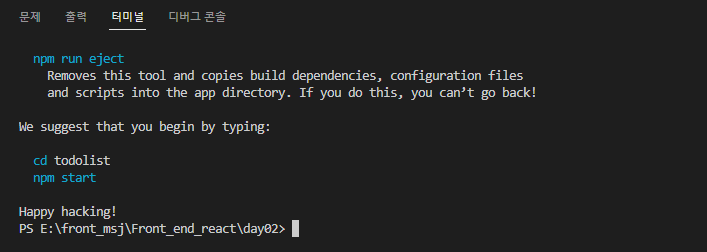명령어를 작성하여 실행하면 리액트 라이브러리 폴더를 생성하기 시작합니다(시간이 좀 걸릴 수 있습니다)