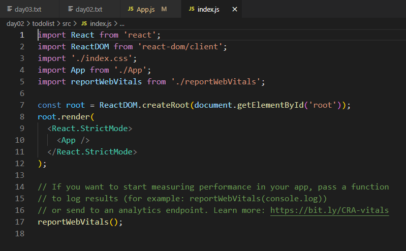 작성되있는 index.js의 코드입니다. 여기서 reportWebVitals과 연관된 코드를 지우겠습니다