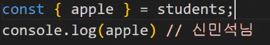 이런식으로 "const { apple, banana, orange } = students;" 로 키값을 전체를 다 찾아올수도 있습니다