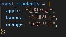 students라는 상수 변수에 apple:신민석님, banana:김예찬님, orange:송연우님 이라는 세 변수를 넣어줍니다